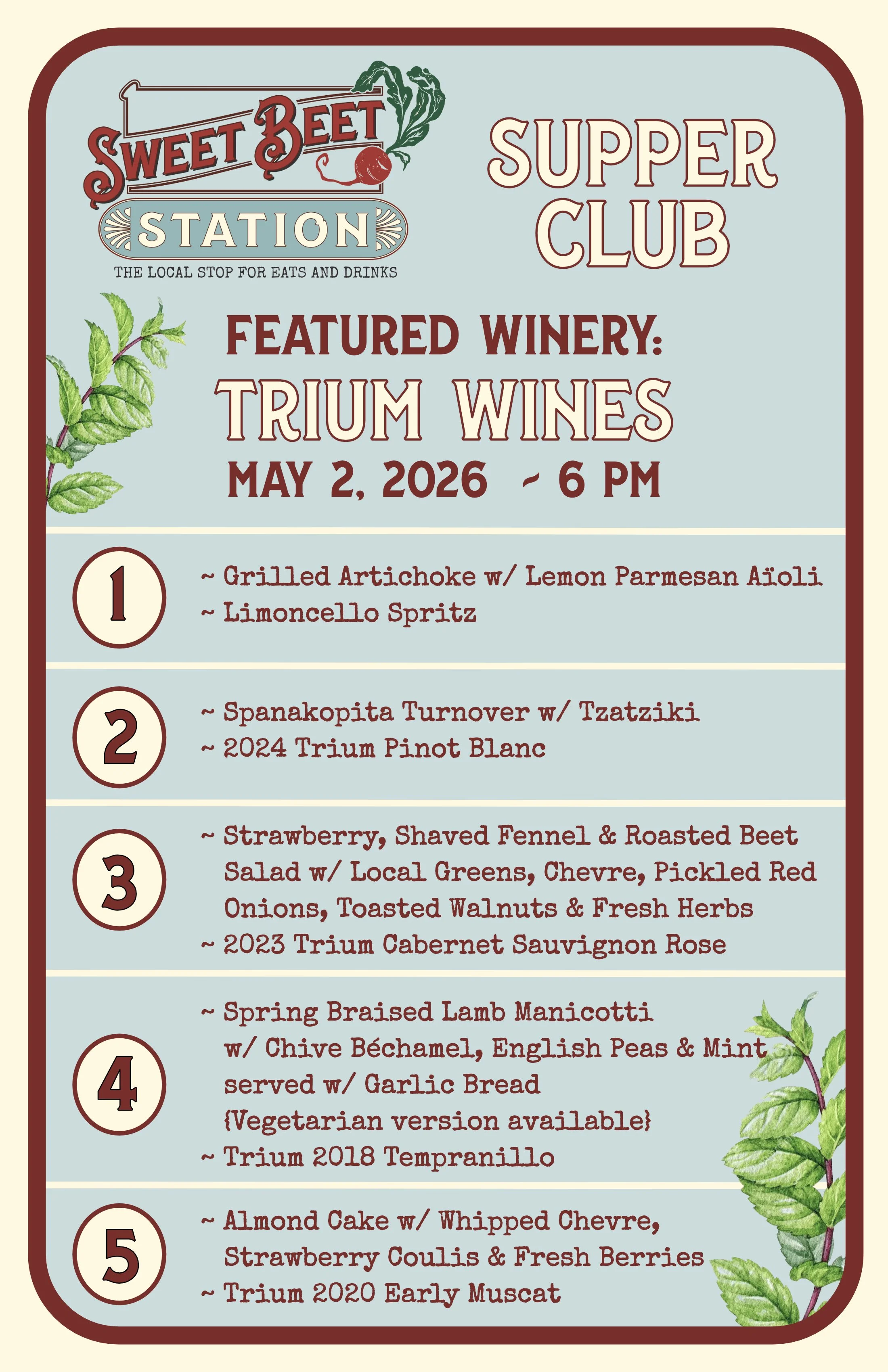 This month we’re partnering with our neighbors at Trium Wines for a five-course Spring Feast, perfectly paired with their exquisite wines. The menu celebrates Spring in Southern Oregon: bright, fresh flavors layered with a few richer, indulgent courses, each paired with Trium's incredible wines.